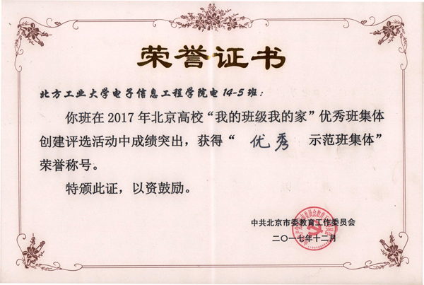 近日,2017年北京高校“我的班级我的家”优秀班集体创建评选活动在北京工业大学举行,bat365电信学院电14-5班在全市百余个参赛班集体中脱颖而出,荣获2017年北京高校“优秀示范班集体”荣誉称号。十年寒窗苦争渡,群英荟萃晋元路跨别高中,挥别父母,35名同学集合在北京美丽的西山脚下,这里钟灵毓秀,风光怡然。日月交替,夏秋轮回,这里是梦开始的地方。bat365正版唯一官网电子信息工程学院电14-5班组建于2014年9月,共有35人,其中党...