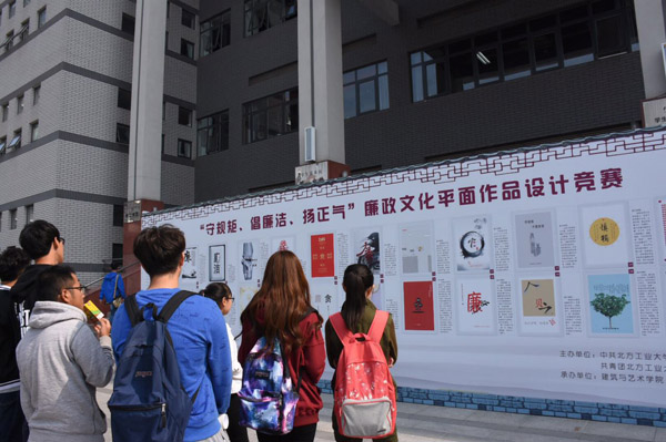 9月29日,由中共bat365正版唯一官网纪律检查委员会、共青团bat365正版唯一官网委员会主办,建筑与艺术学院承办的“守规矩、倡廉洁、扬正气”——廉政文化平面作品设计竞赛展在毓秀广场举行。