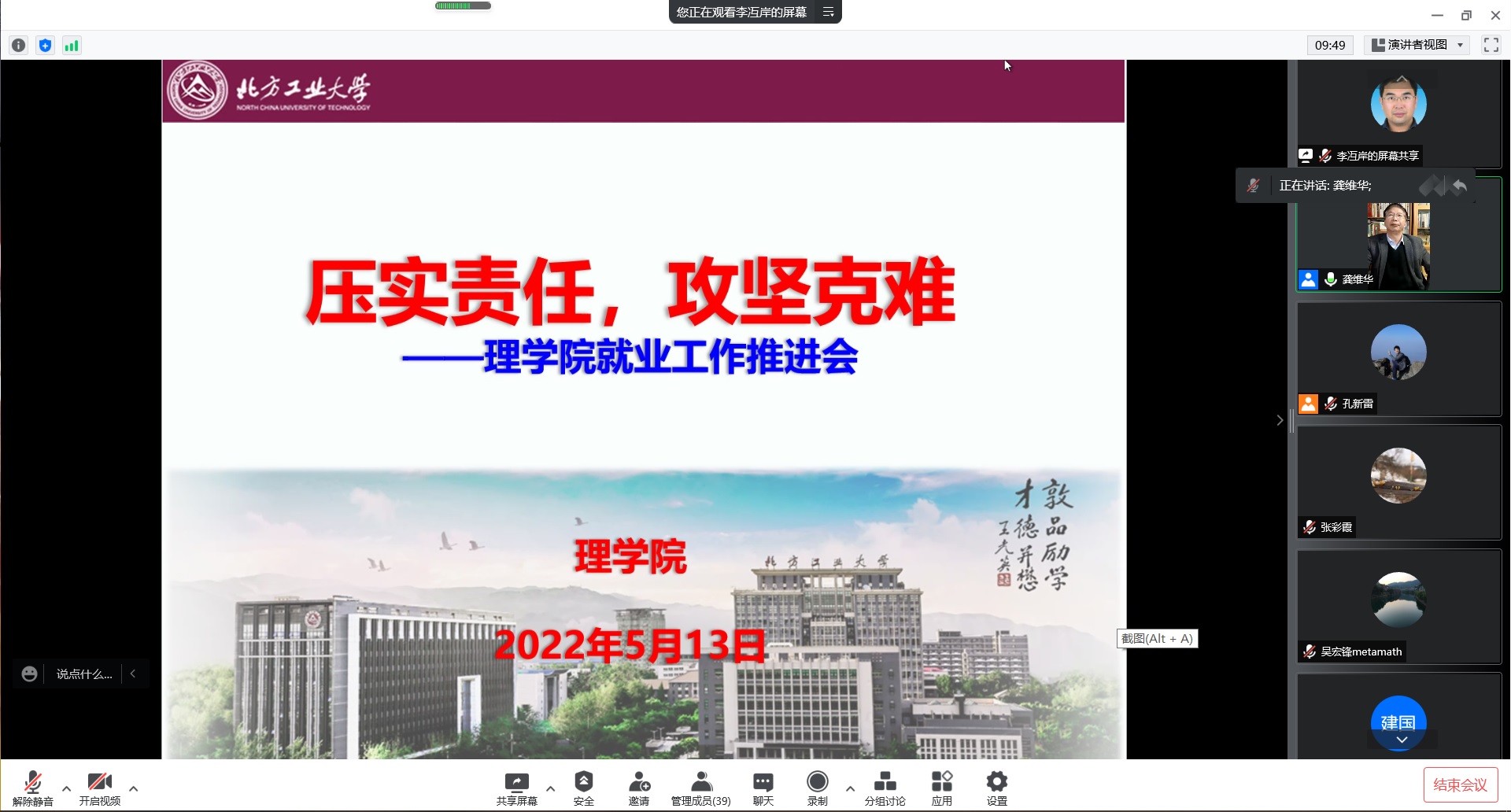 近日,理学院召开2022届毕业生就业工作线上推进会,学院班子成员、各系主任、责任教授、毕业研究生导师全体、数学系和统计系全体教师、办公室和学工办全体成员参加会议。院党委书记龚维华传达了学校就业推进会精神和缪劲翔书记、张立峰校长关于当前就业工作的指示要求。龚维华指出,就业是民生工程,是学院持续发展的动力之源,全院教职工要认清当前就业工作面临的严峻形势与挑战,按照学校要求,严格落实每周院党政联席、院务...
