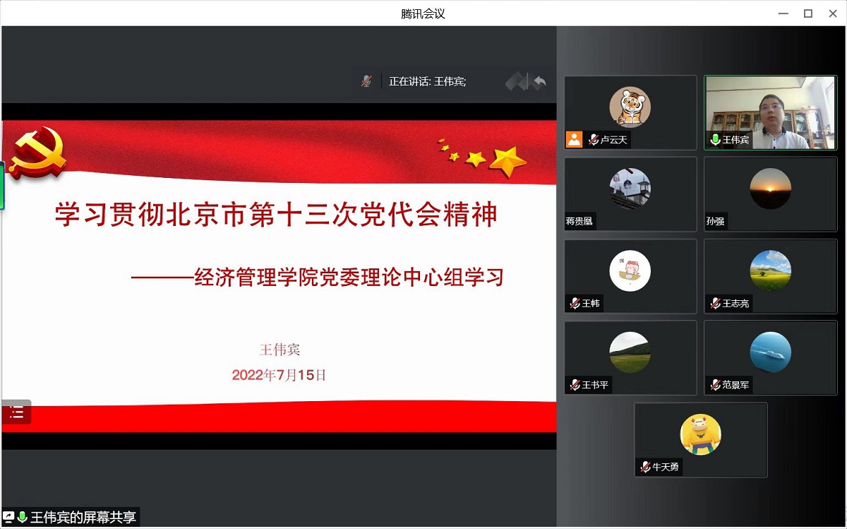 7月15日下午,经济管理学院党委理论学习中心组召开线上学习会,集中学习北京市第十三次党代会精神。会议由学院党委书记王伟宾主讲,全体党委委员参加。王伟宾领学了北京市第十三次党代会报告。他指出,大会报告全面回顾和深刻概括了过去五年北京各项事业取得的辉煌成就和实践体会,明确提出了今后五年发展的指导思想、奋斗目标和重要举措,充分体现了北京“首善”标准,为未来北京经济社会全面发展奠定了坚实基础和政治保障。习...