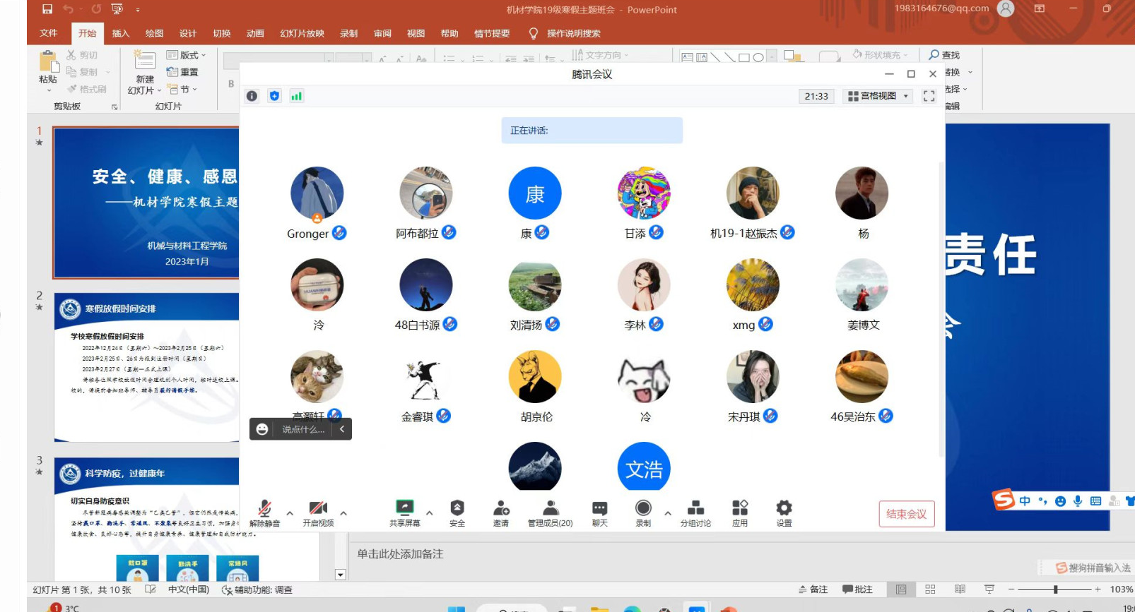 为贯彻落实学校《关于2023年元旦、寒假放假工作安排的通知》文件要求,帮助同学们合理规划大学生涯,进一步增强安全意识、底线意识,引导同学们度过一个充实又有意义的寒假。2023年1月16日至20日,机材学院面向全体本科生、研究生组织各班开展了以“安全、健康、感恩、责任”为主题的线上集体学习暨寒假主题班会和研究生组会,确保寒假期间学生工作开启“不断线、常更新”模式。会上,各班班导师、研究生导师向同学们通告了学校...