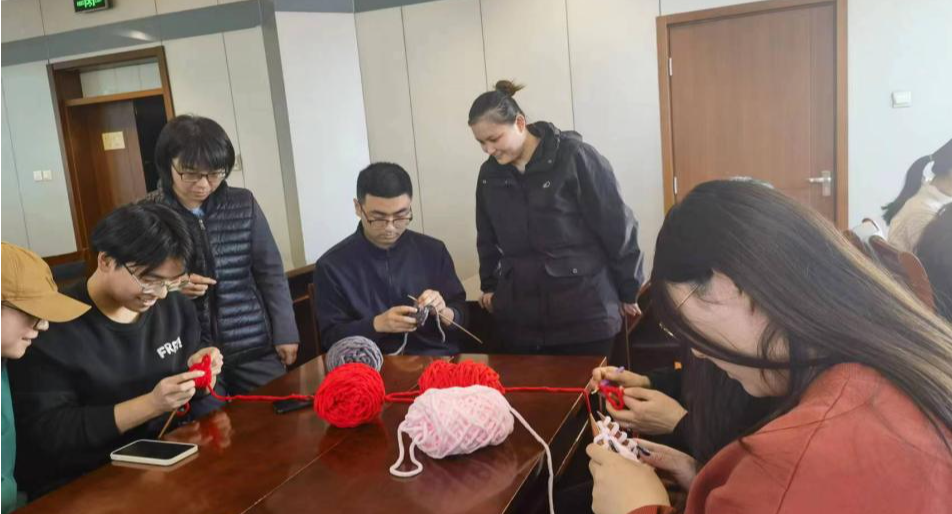 12月27日下午,“针心针意”公益劳动课在国教中心301会议室开班。选中该课的同学,学习多种毛线编织技法,亲手制作围巾、帽子、手套等实用保暖用品,用自己的劳动成果为这个冬天增添暖意。课堂上,留学生公寓服务部杨爽经理介绍了劳动教育的时代背景以及bat365开展劳动教育课程的实践与探索,然后与部门员工靳亚娟一起为零基础的“编织小白们”讲解如何拿针、如何绕线,从编织手势到基础的起针,逐步提高难度,介绍正针和收针。4...