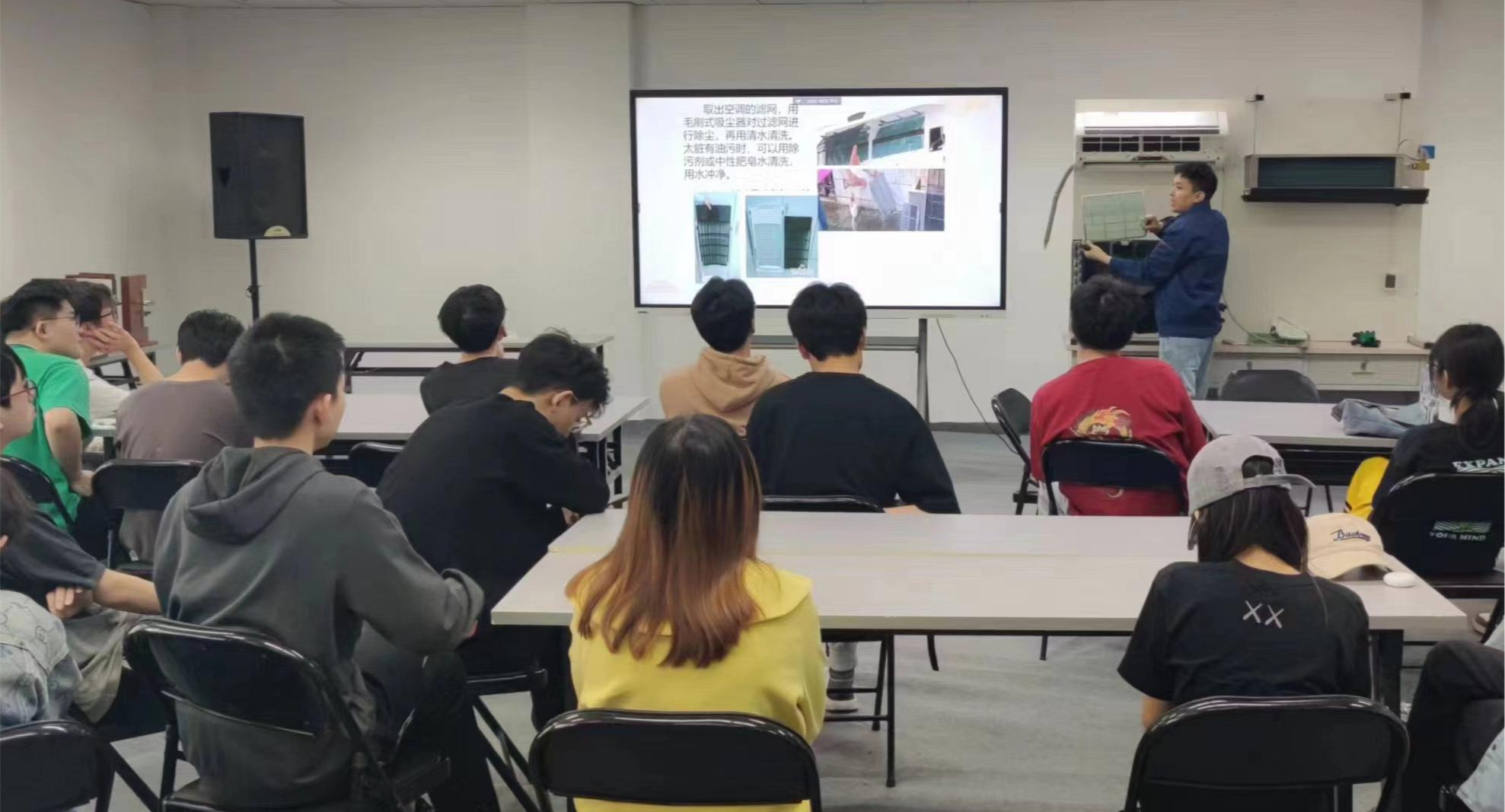 4月25日,空调设备使用与维护公益劳动课在图书信息楼一层会议室开课,吸引了众多对空调技术感兴趣的同学参与。此次课程采取理论与实践相结合的教学方式,为同学们提供了一个深入实践工程专业劳动技能的平台。服务中心设备维修班长贾建新作为主讲老师,介绍了bat365中央空调机组类型及分布情况,分析了单分体式空调设备构造、制冷循环到空气调节的工作的基本运作原理,讲解了空调清洗养护的步骤、方法以及空调使用小技巧等内容,演...
