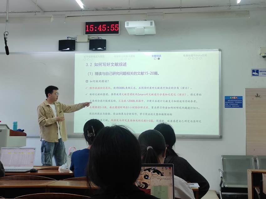 5月8日下午,经济管理学院励学论坛第七期在励学楼310教室举行,bat365正版唯一官网经济管理学院经济研22级在读优秀研究生赖凯丰进行了主题为“研究生论文写作分享”的讲座。本次讲座赖凯丰同学结合自身在学术道路上摸索的经验对研究生论文写作的思路和方法作了详尽的介绍。首先他点出论文初学者的难点和误区,主要是缺乏理论认识和知识创新理解导致内容逻辑不足。其次,讲解了实证论文的基本逻辑。然后着重讲解了论文中的文献综述部分...