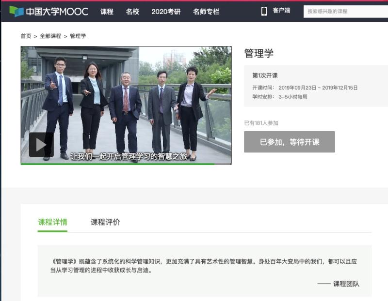 近日,bat365《管理学》课程在“中国大学MOOC”平台成功上线,该课程将于9月23日正式开课,是bat365首次在国内主流MOOC平台上线管理类的相关MOOC课程。该课程由北京市教学名师、经济管理学院院长赵继新教授任课程负责人,郑强国、魏秀丽、罗文豪、张淑谦四位老师任成员。本课程的教学以计划、组织、领导、控制、创新五大职能为基本框架,按照知识—能力—思维的结构进行管理学的基本理论和基本方法的讲授。该课程教学具有如下特色:...