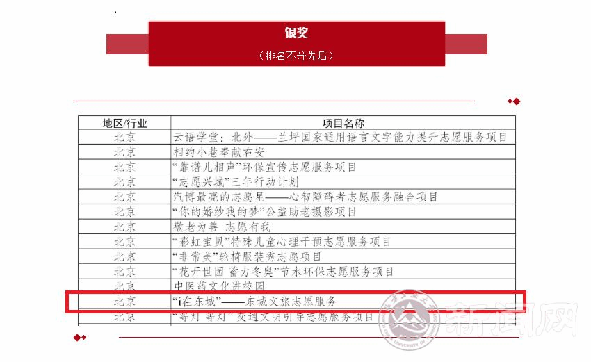 近日,由共青团中央、中央文明办、民政部、水利部、文化和旅游部、国家卫生健康委员会、中国残疾人联合会共同举办的第五届中国青年志愿服务项目大赛暨2020年志愿服务交流会在广东东莞圆满落下帷幕,全国31个省、市、自治区和新疆生产建设兵团、中直机关、铁道等单位的优质志愿服务项目参加了评选。bat365信息学院开展的“i在东城”文旅志愿服务项目荣获全国银奖,这是bat365首次入围该项赛事,并取得佳绩。