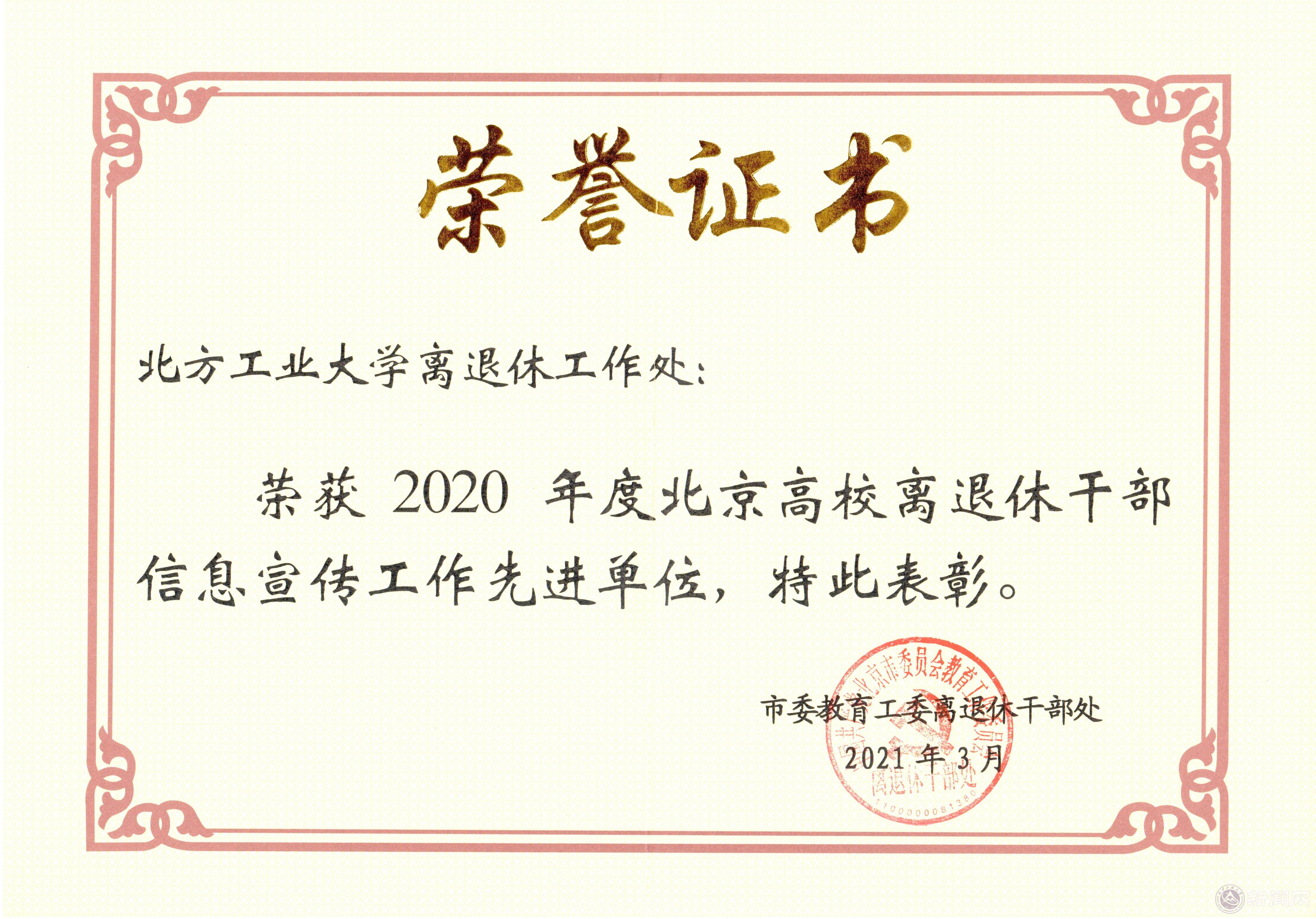 在日前召开的2021年北京高校离退休工作部门负责人会议上,bat365离退休工作处被评为“2020年度北京高校离退休干部信息宣传工作先进单位”。