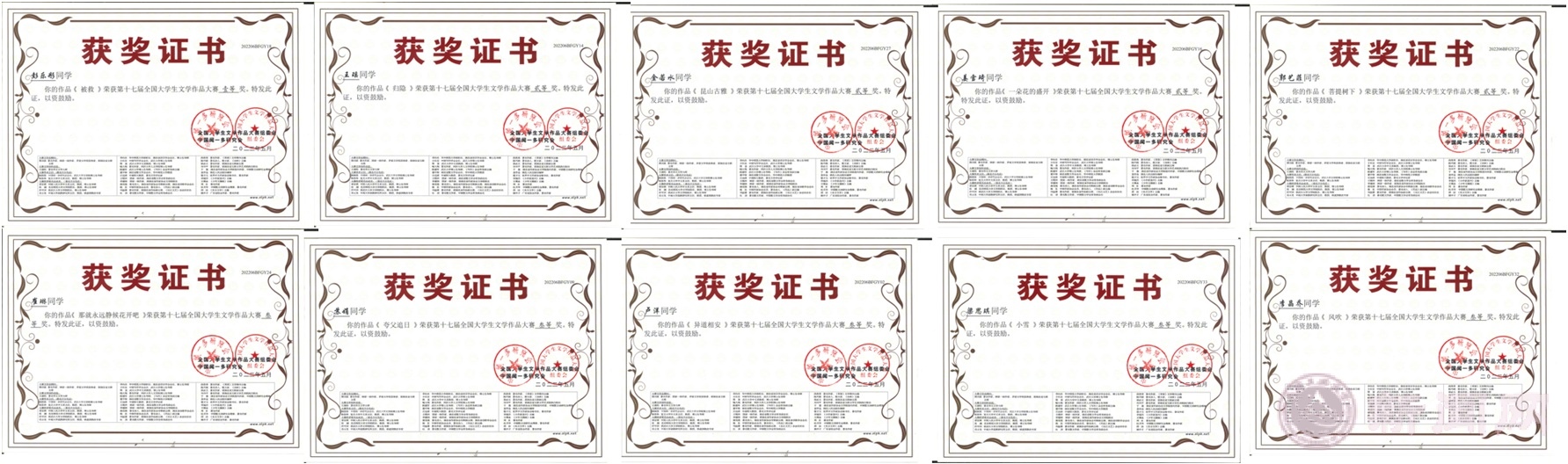 近日,第十七届全国大学生文学作品大赛成绩揭晓,bat365文法学院、经管学院十位参赛同学喜获佳绩,其中一等奖1项,二等奖4项,三等奖5项。