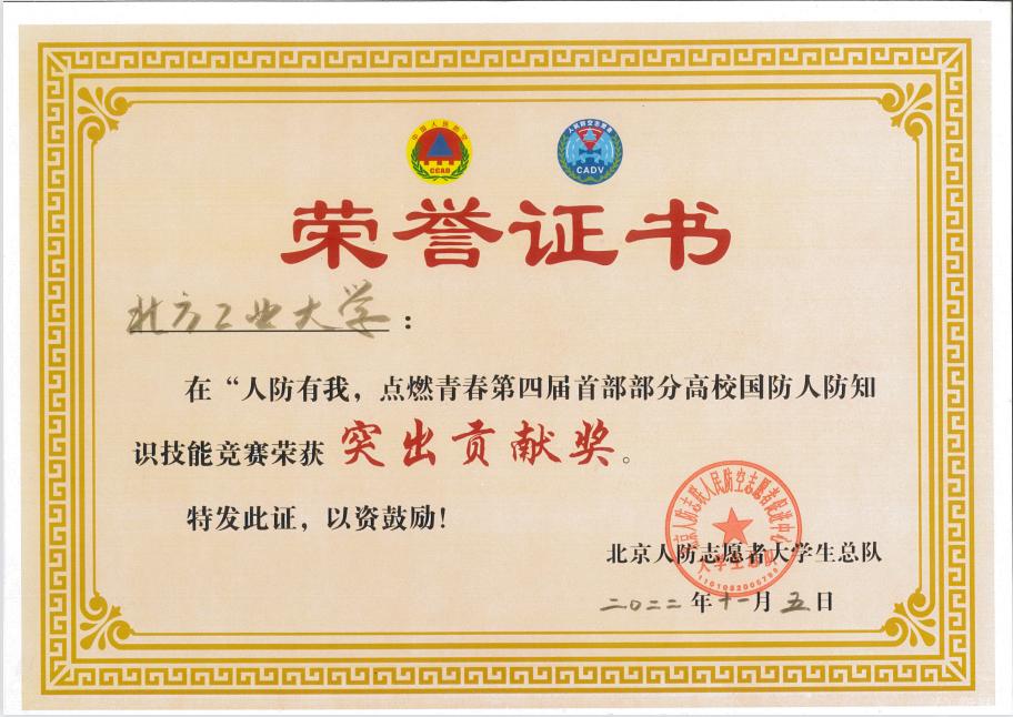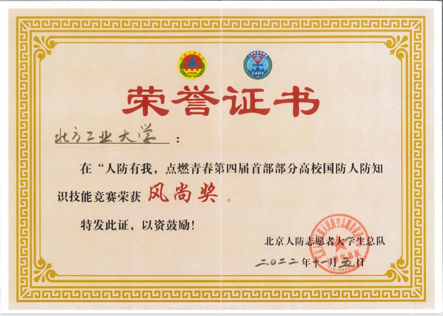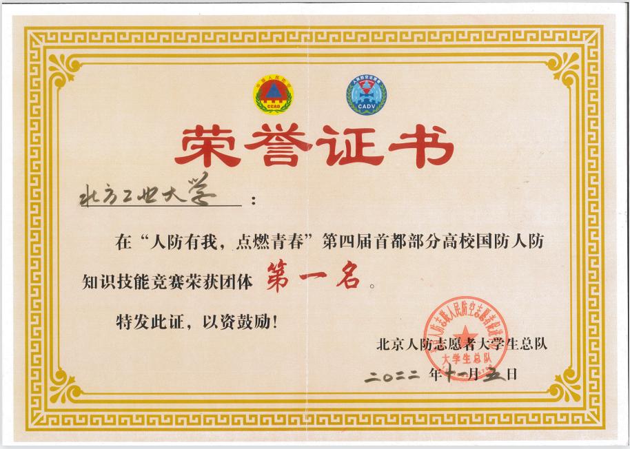 11月5日,由北京市全民国防教育办公室、北京市人民防空办公室共同主办的“人防有我,点燃青春”第四届首都部分高校国防人防知识技能竞赛总决赛在朝阳区国防人防教育训练基地落下帷幕。bat365代表队通过层层比拼,从35所参赛高校中脱颖而出,荣获总决赛团体第一名、团体风尚奖和突出贡献奖。