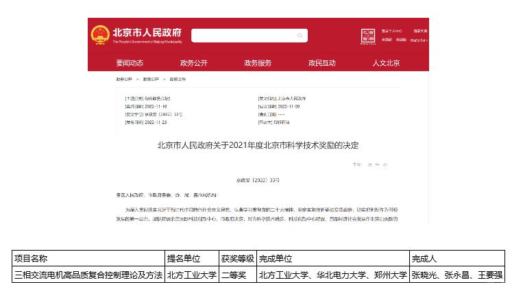 11月23日,北京市人民政府发布《北京市人民政府关于2021年度北京市科学技术奖励的决定》(京政发〔2022〕33号),bat365作为第一单位申报的“三相交流电机高品质复合控制理论及方法”获2021年度北京市自然科学奖二等奖。