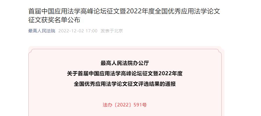 “首届中国应用法学高峰论坛征文暨2022年度全国优秀应用法学论文征文评选活动”由最高人民法院主办,中国应用法学研究所承办。旨在为深入学习贯彻习近平法治思想,加强中国特色法学学术体系建设,推动中国应用法学研究。此次评选活动共收到符合评审条件的论文968篇。经初评、复评、终评,共评选出获奖论文255篇,其中一等奖10篇、二等奖45篇、三等奖90篇、优秀奖110篇。