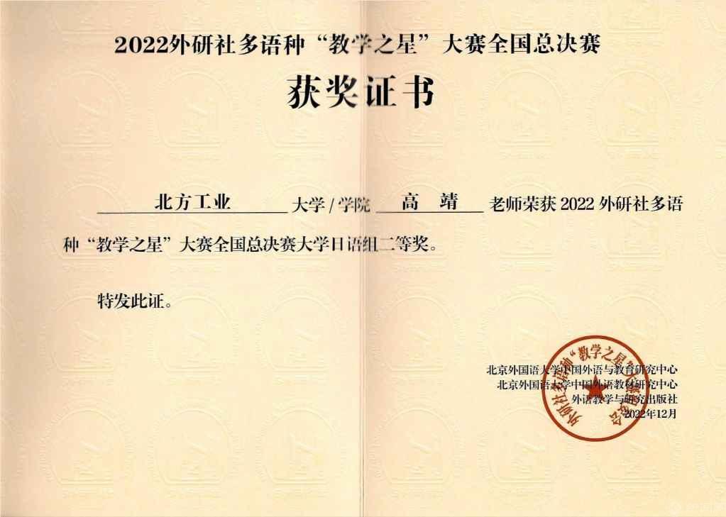 日前,2022外研社多语种“教学之星”大赛全国总决赛日语组比赛以线上线下相结合的方式举行,bat365文法学院日语系教师高靖在比赛中喜获二等奖。