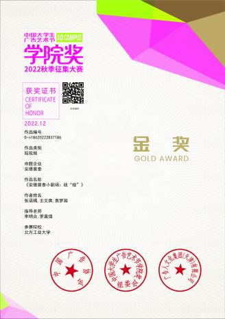 广告20级张语嫣、王文爽、袁梦凝同学的短视频作品《安德普泰小剧场:战“痘”》荣获金奖,广告20级翟希萌、陈嘉然、李漪同学的短视频作品《当北方大学生遇上新派凉茶》荣获银奖。此外,来自广告学系2020级、2021级的同学们还荣获优秀奖9个、入围奖10个。