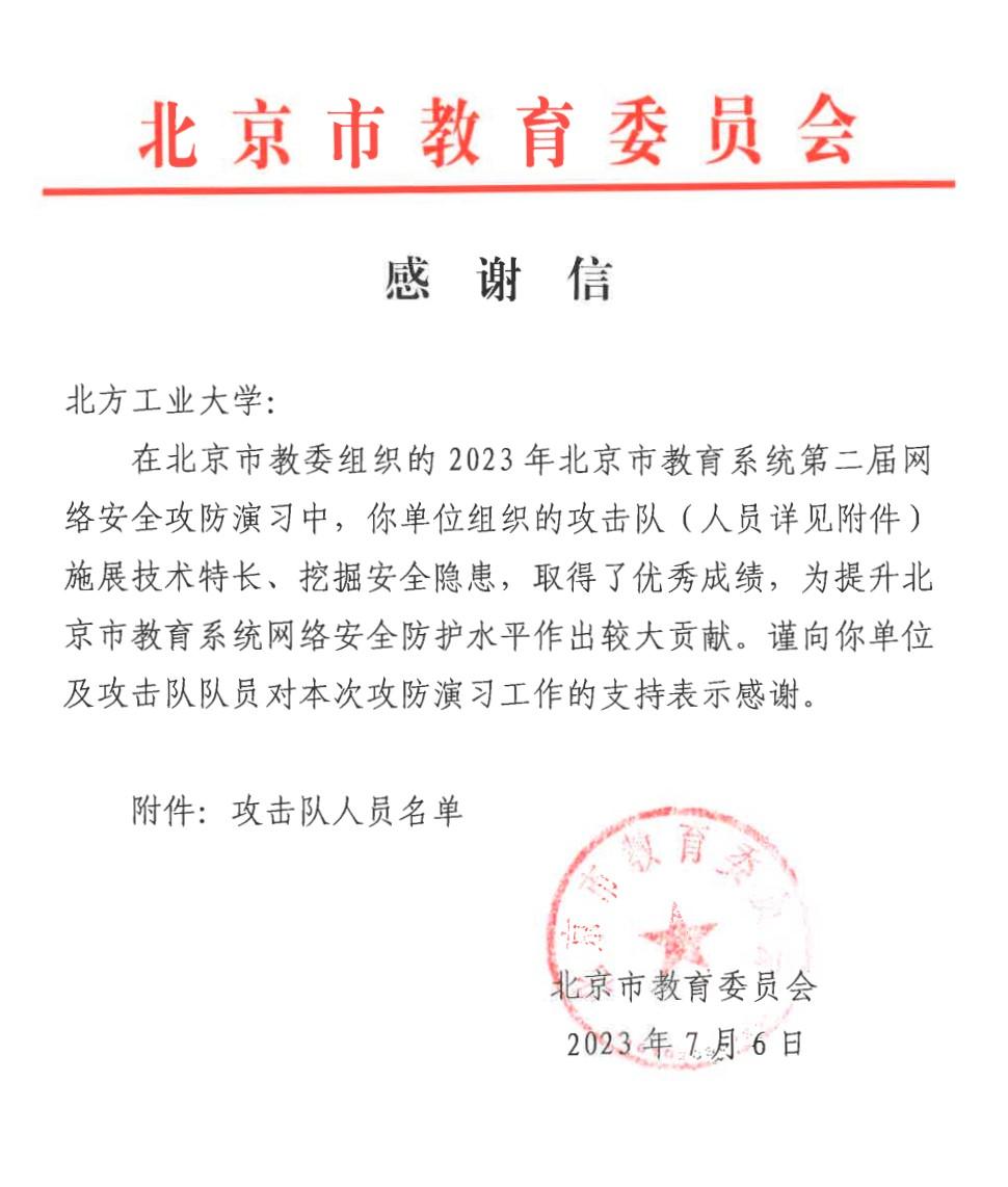 7月6日,bat365收到北京市教育委员会的感谢信,对网信中心、信息安全专业师生在教育部举办的教育系统网络安全攻防演习中的突出表现给予了高度赞扬。