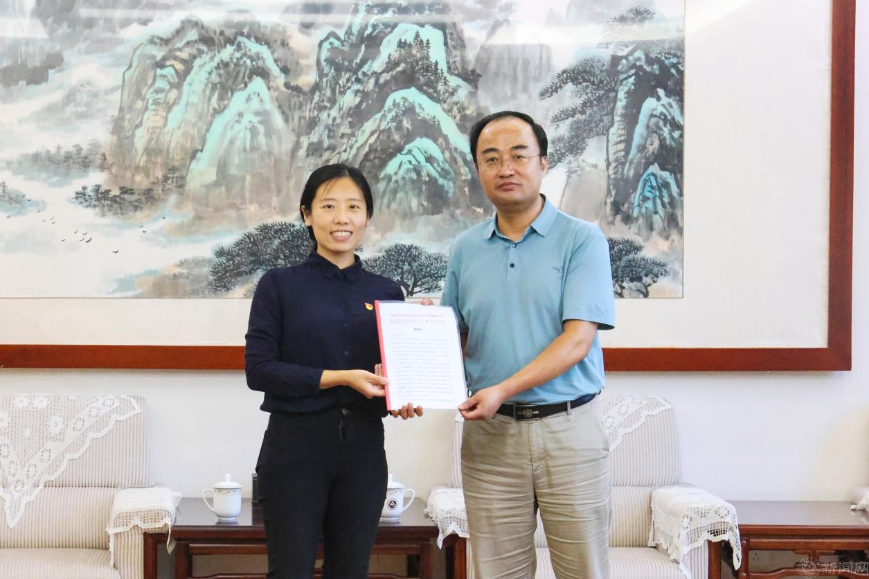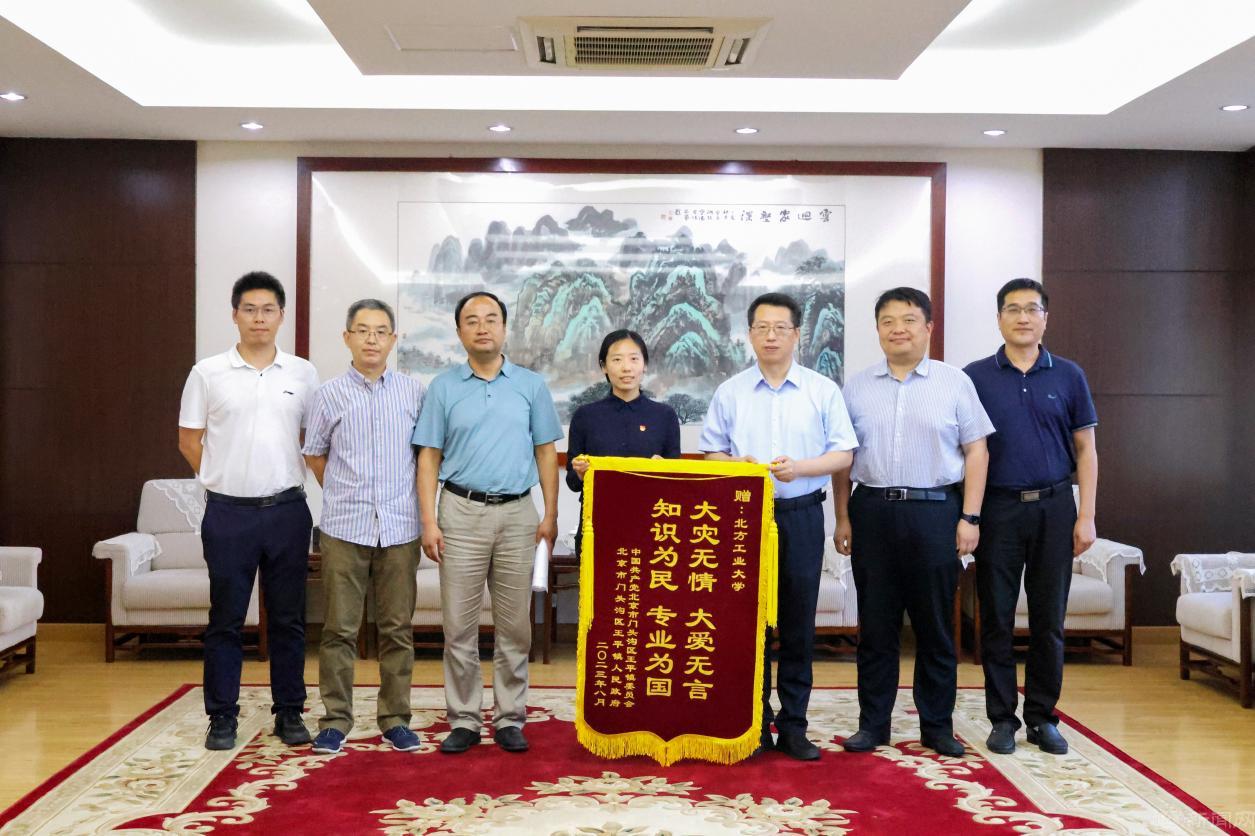 沈若萌代表门头沟区王平镇党委、镇政府向学校赠送了“大灾无情 大爱无言 知识为民 专业为国”的锦旗以及感谢信。