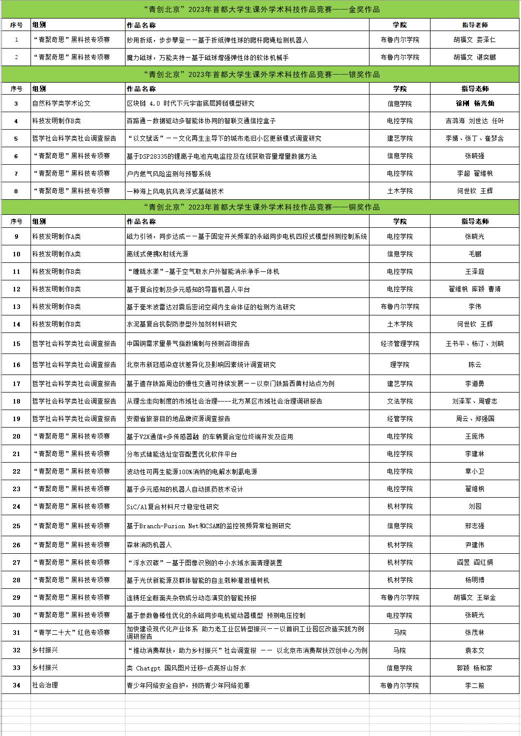 为充分调动校内资源、有效凝聚工作合力,校团委、教务处、科研院、招生就业处联合组成竞赛组委会,统筹宣传动员、组织申报、专家评审等各项工作。对标“挑战杯”大学生课外科技作品竞赛国赛、北京市赛章程和赛事结构,广泛动员、认真筹备,组织校内选拔赛,共收到主赛道参赛作品233项、专项赛道作品52项。其中主赛道作品经专家评审团评选,评选出校内金奖作品10项,银奖作品15项、铜奖作品27项,并择优推选作品参加2023年“挑战杯”首都大学生课外科技作品竞赛。