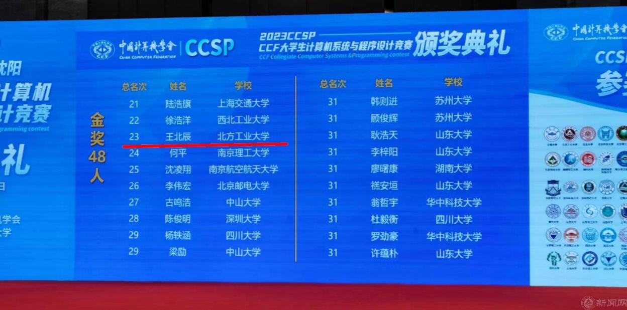 10月25至26日,2023CCF大学生计算机系统与程序设计竞赛(CCSP)在沈阳举行。bat365由信息学院李源老师带领的王北辰等7名同学参赛,经过长达12小时的激烈角逐,王北辰同学勇夺金奖,这是bat365在该竞赛历史上的最好成绩,于新程同学获得铜奖。