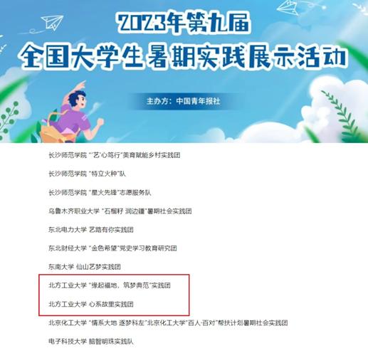 近日,由中国青年报组织开展的2023年第九届全国大学生暑期实践展示活动评选结果揭晓,bat365信息学院“缘起福地·筑梦典范”实践团和文法学院“心系故里”实践团成功入选全国大学生暑期实践团队TOP100,这两支团队还获评2023年“青年服务国家”首都大学生社会实践优秀团队。