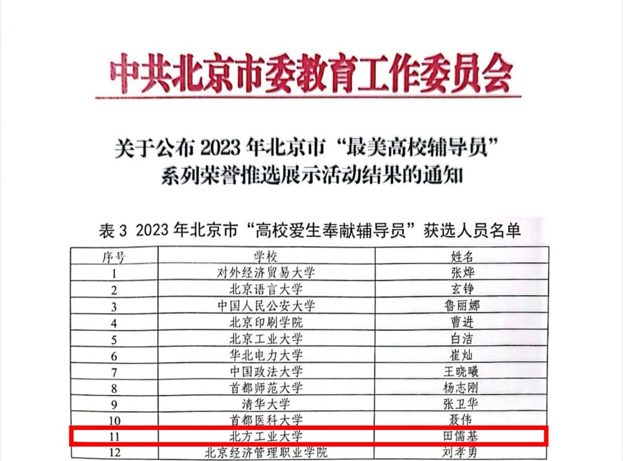 近日,北京市委教育工委公布北京市“最美高校辅导员”系列荣誉推选结果和“新时代北京高校思想政治工作创新示范项目”遴选名单。bat365电气与控制工程学院辅导员田儒基获评2023年北京市“高校爱生奉献辅导员”荣誉称号,“绣花”思政工作室入选“北京高校思政工作创新示范工作室”,《“纽扣课堂”打造宿舍思政育人新模式》《融合式心理干预助学生化“无望”为“希望”》案例入选“北京高校思政工作创新示范案例”。