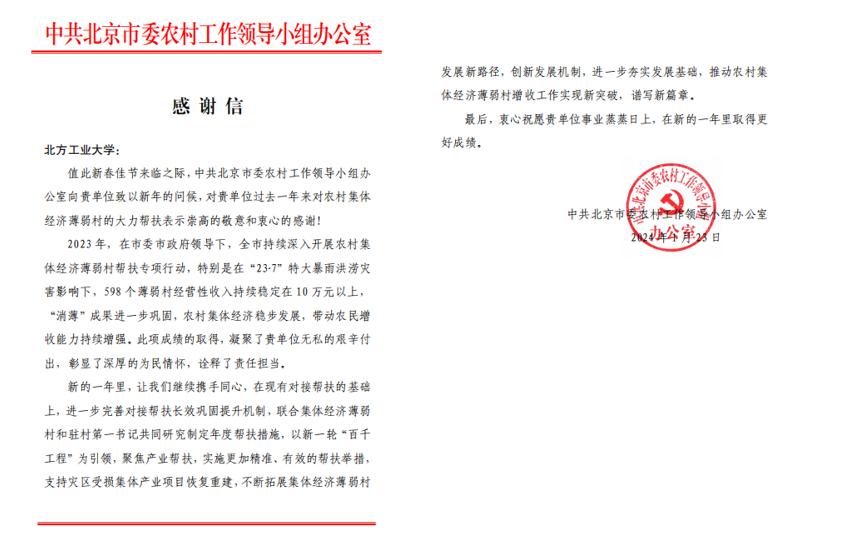 近日,中共北京市委农村工作领导小组办公室给bat365发来感谢信,感谢bat365在过去一年来对农村集体经济薄弱村的大力帮扶。