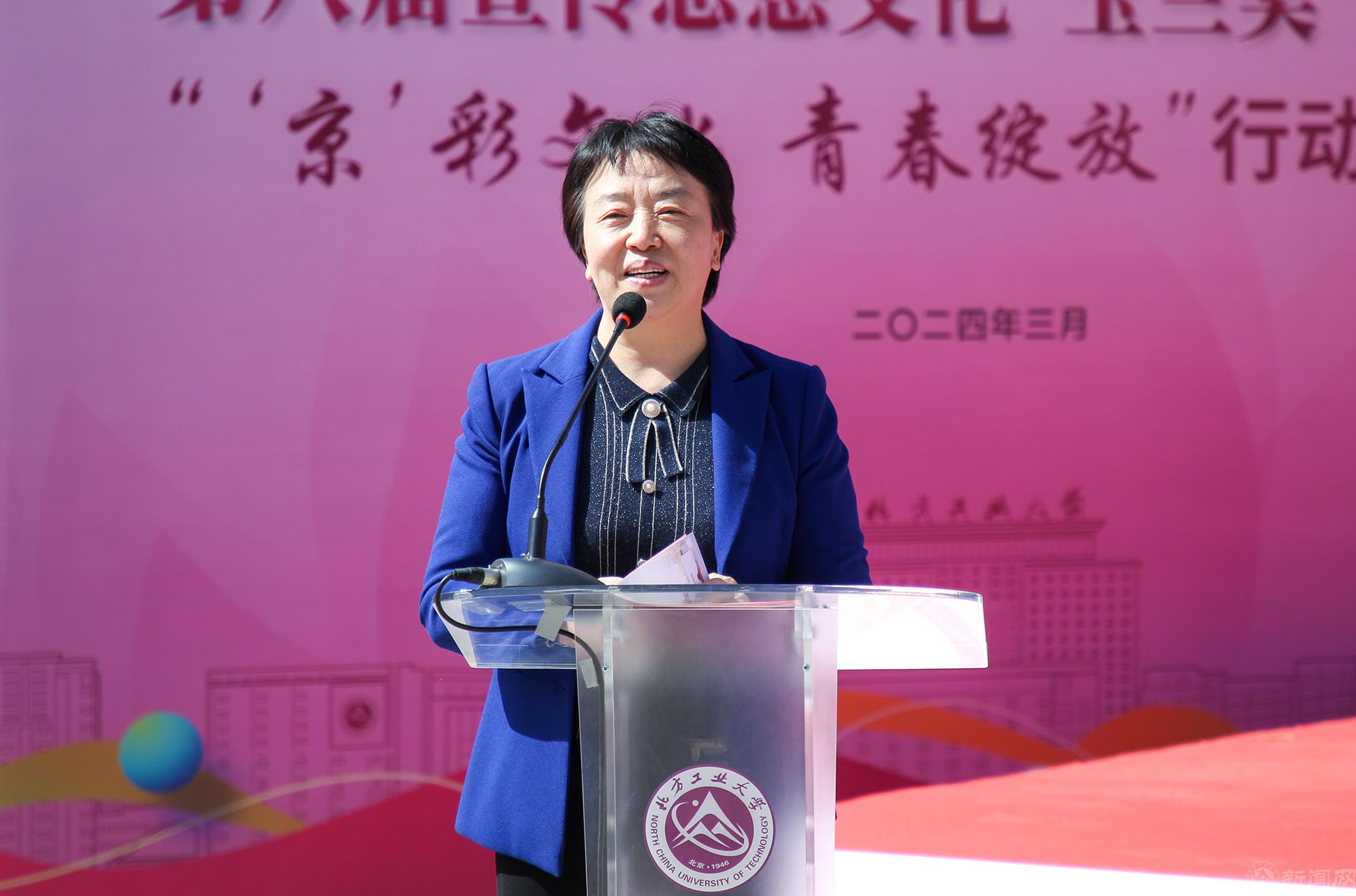 党委副书记田红芳在讲话中,向获奖的集体和个人表示祝贺,预祝“‘京’彩文化 青春绽放”活动在北方工大结出累累硕果。她表示,全校上下要深入学习贯彻习近平文化思想,全面推动宣传思想文化工作高质量发展,不断增强样板建设的动力、信心和底气。田红芳就做好学校宣传思想文化工作提出三点要求:一是在宣传格局构建上出实招,增强工作引领力。巩固完善党委统一领导、党政齐抓共管、宣传部门组织协调、二级单位主动参与的工作机制,凝心聚力形成样板建设的生动实践;二是在文化传承创新上求实效,提升工作感染力。聚焦品牌塑造和内涵挖掘,打造校园文化精品项目,用特色文化浸润学生综合素质养成,提升文化育人的思想感染力和精神震撼力;三是在载体平台建设上用实劲,扩大工作影响力。持续用好主题党团日、宣讲团、纽扣课堂、大思政课等生动载体,推动媒体融合,用高质量宣传文化作品唱响北方工大样板建设最强音。
