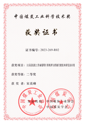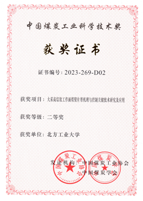 “大采高综放工作面煤壁片帮机理与控制关键技术研究及应用”获评中国煤炭工业科技进步奖二等奖。该项目揭示了大采高综放工作面煤壁破坏形式与机理,优化了超大采场支架-围岩耦合关系及煤壁注浆加固工艺,有效提高了采煤机开机率和工作面推进速度,取得了良好的经济效益。