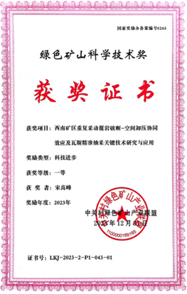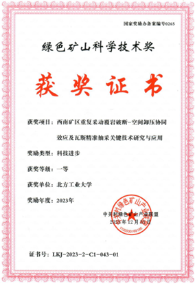 “西南矿区重复采动覆岩破断-空间卸压协同效应及瓦斯精准抽采关键技术研究与应用”获评绿色矿山科技进步奖一等奖。该项目揭示了煤层群开采空间卸压机制及采动裂隙场卸压瓦斯运移规律,优化了定向长钻孔分段瓦斯抽采技术,为近距离高瓦斯煤层群重复采动工作面的安全高产高效提供了理论技术支持。