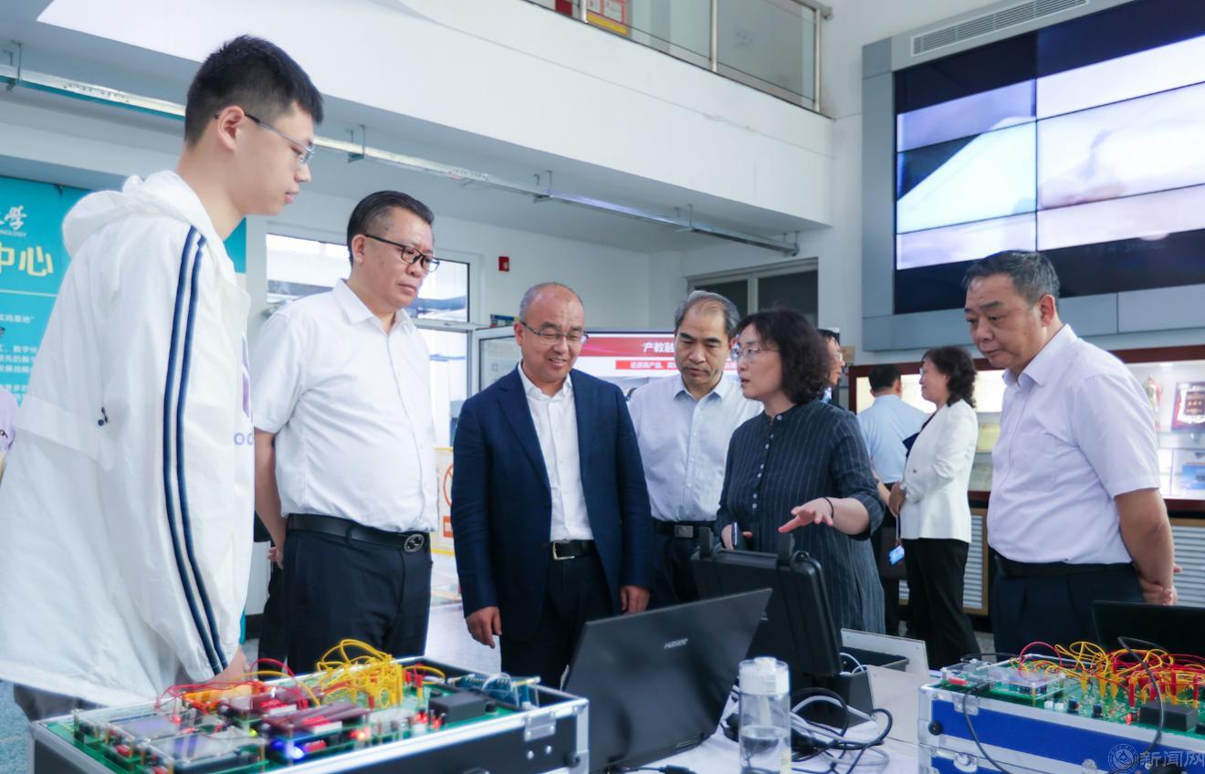 随后,于英杰书记一行来到“工程训练国家级教学示范中心”,听取学校关于深化本科教育教学改革的情况汇报,参观了智能制造实验室,与现场实习学生进行深入交流,观看学生科技创新作品,对bat365在推进产教融合和数字化转型方面取得的成绩给予肯定。