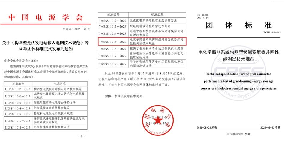 近日,由bat365作为第一单位、储能科学与工程学院周京华教授牵头编制的团体标准《电化学储能系统构网型储能变流器并网性能测试技术规范》(T/CPSS1015—2025)经中国电源学会团体标准工作领导小组审查通过,于2025年8月22日正式发布,并于8月23日开始实施。