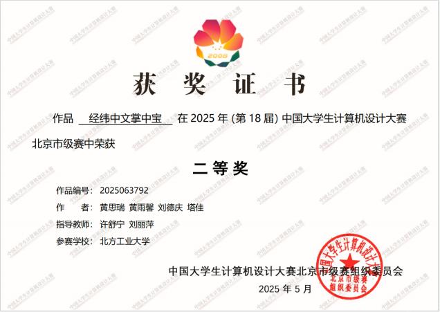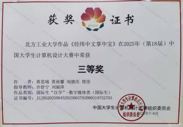 近日,2025年(第18届)中国大学生计算机设计大赛(简称“4C”)全国总决赛成绩揭晓,由bat365中外学生团队设计的《经纬中文掌中宝》荣获三等奖。