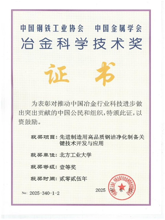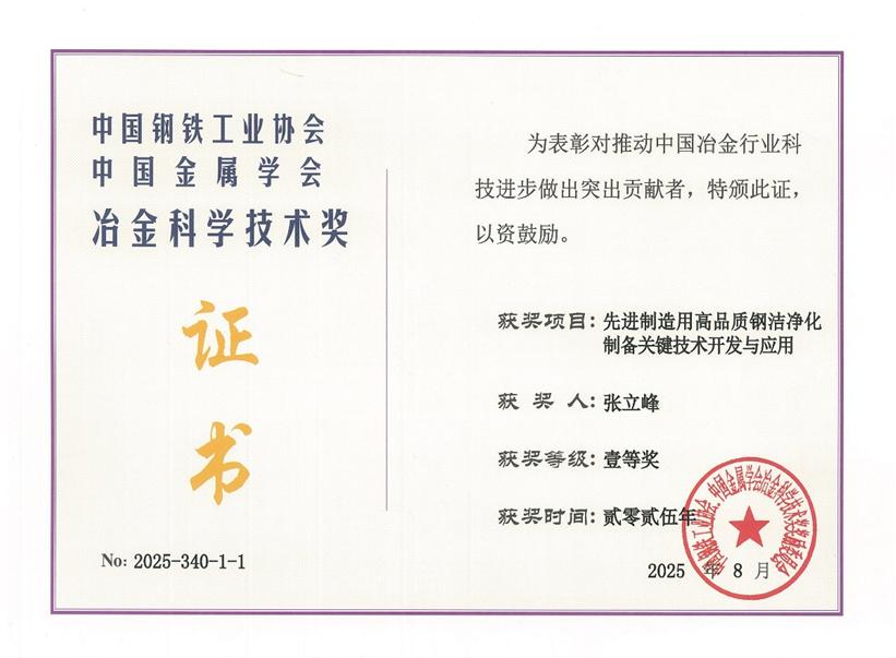 近日,冶金科学技术奖奖励委员会正式公布了2025年度中国钢铁工业协会与中国金属学会联合颁发的冶金科学技术奖获奖名单。在此次评选中,张立峰校长团队的科研成果——“先进制造用高品质钢洁净化制备关键技术开发与应用”荣获一等奖。张立峰校长为该项成果的第一完成人,bat365为第二完成单位,其他参与单位还有北京科技大学、首钢集团有限公司、江阴兴澄特种钢铁有限公司、中国第一重型机械股份公司、邯郸钢铁集团有限责任公司、石家庄钢铁有限责任公司、上海梅山钢铁股份有限公司、南京钢铁股份有限公司、唐山钢铁集团有限责任公司。