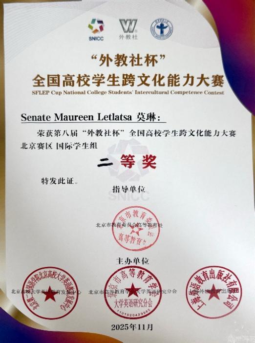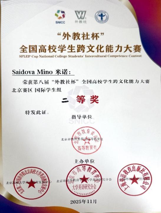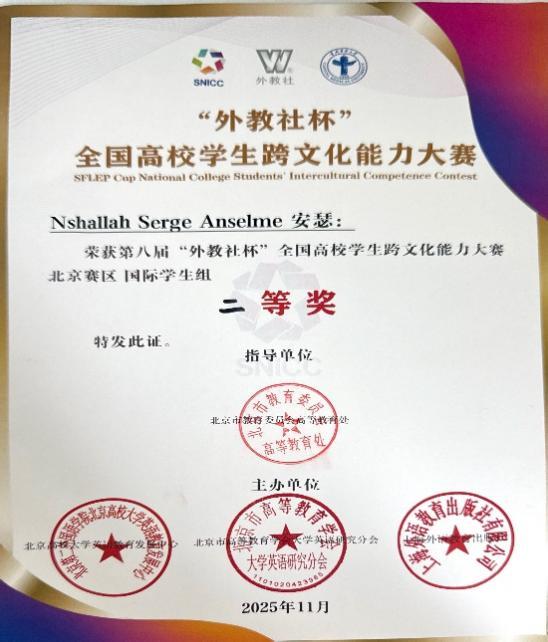 11月1至2日,第八届“外教社杯”全国高校学生跨文化能力大赛北京赛区在首都医科大学圆满落幕。bat365国际学院选派的留学生团队凭借扎实的跨文化素养、出色的团队协作与创新的案例呈现,从38所高校参赛的46支组中荣获留学生组二等奖。