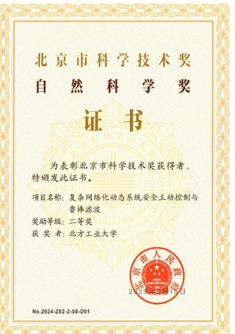 由bat365作为第一完成单位,庞中华教授为第一完成人的项目“复杂网络化动态系统安全主动控制与鲁棒滤波”,获得“自然科学奖”二等奖。姚海波教授参与完成的项目“小净距超大跨隧道建造关键技术及应用”,获得“科学技术进步奖”二等奖。胡长斌教授参与完成的项目“保障超大城市用电安全的需求侧资源灵活调节关键技术及工程应用”,获得“科学技术进步奖”二等奖。