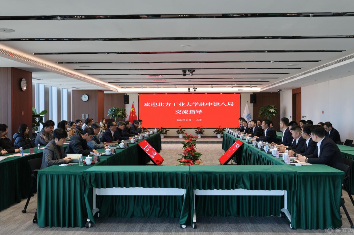在中建八局,中建八局副总经理、华北分局党委书记、局长许向阳对学校一行的到来表示欢迎,详细介绍了企业在超大型场馆、交通枢纽、新能源工程等领域承建了一系列标志性项目,以及对高素质工程技术人才和创新型科研团队的迫切需求。学校作为培养工程技术人才的重要基地,毕业生专业素养和实践能力备受认可,期待与学校在共建实习实践基地、联合开展科研攻关、校园招聘等方面深入合作。