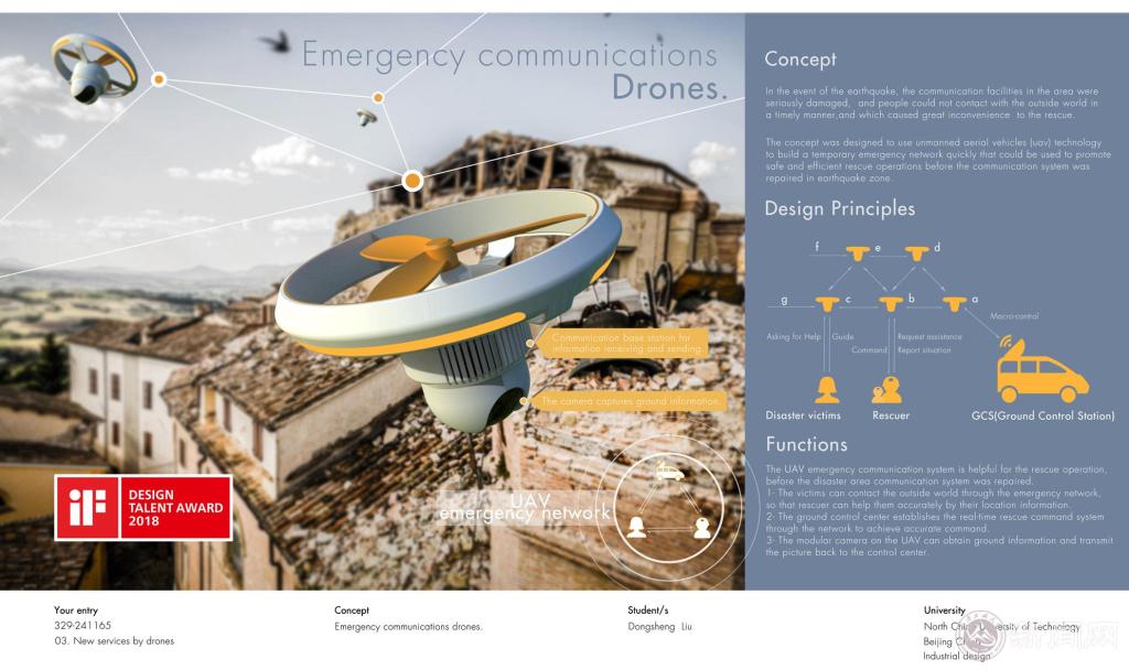 刘东升同学在导师刘永翔教授指导下,认真设计、积极备赛,其参赛作品“Emergency Communication”规划了无人机技术在应急通讯领域创新性的服务设计模式,即利用无人机快速机动的特点,在通讯阻断的受灾区域,快速建立临时应急通讯网络,以促进更加高效、准确、迅捷的救援行动。大赛评委认为,该设计准确把握了抗灾救援的需求,是把无人机技术运用到灾害救援行动中的一个有效探索。该作品将在位于德国汉堡的iF设计博物馆、iF设计奖官方网站和iF设计奖官方APP中进行展出。