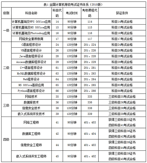 NCRE目前共设置了四个级别,证书体系详见下表: