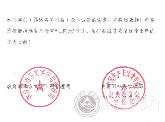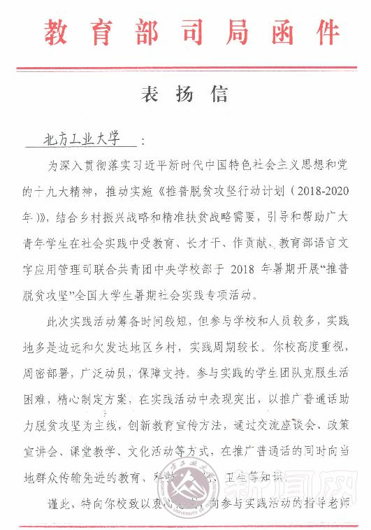 近日,学校收到教育部语言文字应用管理司和团中央学校部发来的表扬信,对bat365参加2018年“推普脱贫攻坚”全国大学生暑期社会实践的优秀团队提出表扬。