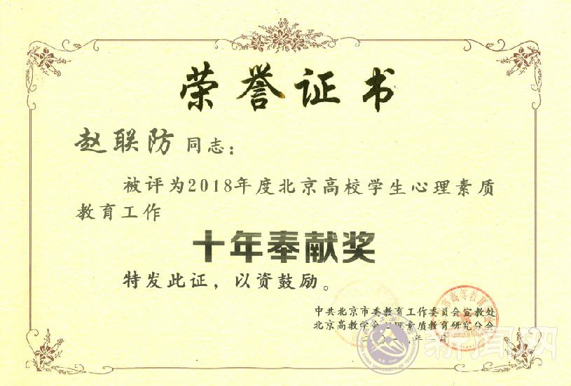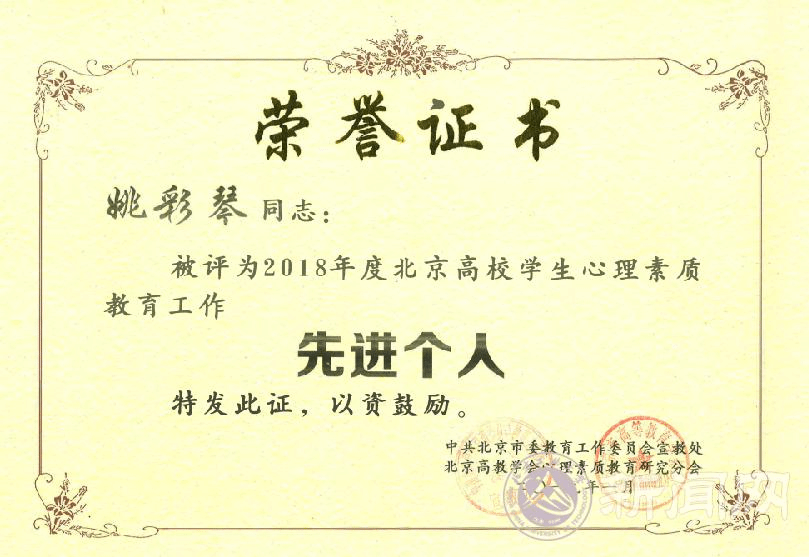 1月11日,由中共北京市委教育工委宣教处和心理素质教育研究会组织召开的“北京高教学会心理素质教育研究分会年会”在清华大学进行。会议就北京高校2018年工作情况进行总结,部署了新一年的工作重点,并对表现突出的单位和个人进行表彰。bat365被授予“特色工作奖”,学工部心理健康教育暨咨询中心教师姚彩琴被授予“先进个人”称号,赵联防荣获“十年奉献奖”。