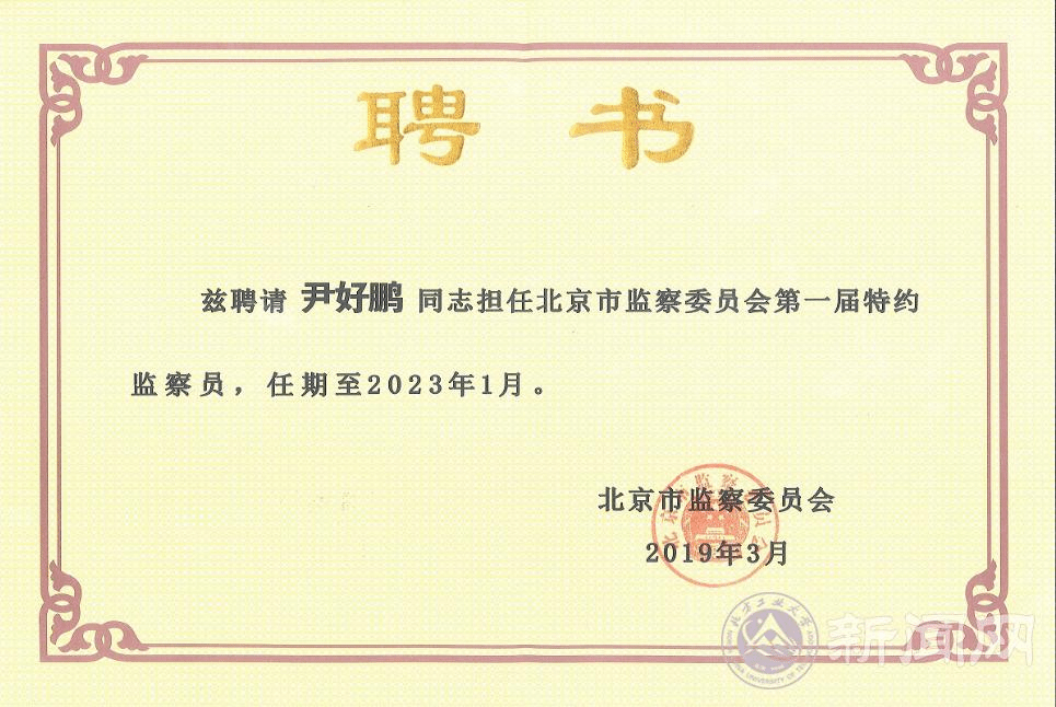 3月29日下午,北京市监察委员会召开第一届特约监察员聘请会议,北京市委常委、市纪委书记、市监委主任陈雍为特约监察员颁发了聘书,bat365尹好鹏副教授被聘为北京市监察委员会第一届特约监察员。