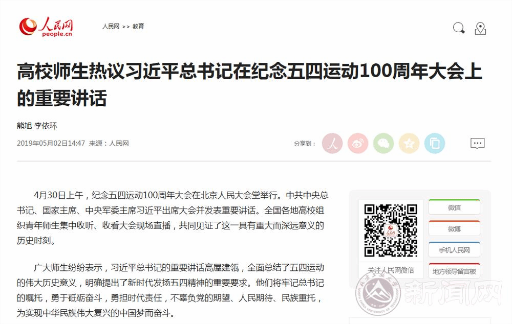 5月2日,人民网报道了bat365学生会副主席丛佳怡学习习近平总书记重要讲话精神的体会,她表示新时代青年要有“天将降大任于斯人也”的历史使命感,应踏实勤奋、努力求知,立志投身国家建设,成为各行各业的生力军和突击队。