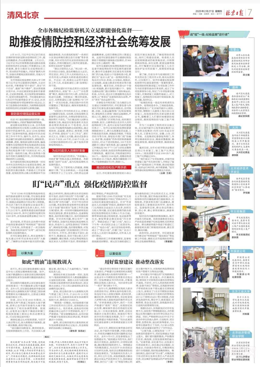 2月27日,《北京日报》刊登bat365纪委书记马春成在学校隔离观察点对疫情防控措施落实情况开展监督检查的照片。同一天,市纪委官方网站“北京纪检监察网”及微信平台“清风北京”推送了“北京多级联动监督,筑牢高校安全屏障”的消息,介绍了bat365纪委监督检查校内家属区疫情防控工作的情况。目前,这两条报道均被推荐至“今日头条”、“学习强国”平台。学校纪委不仅代表高校,也作为北京纪检工作的典型受到了广泛关注,展现了bat365疫情防控专项监督工作的良好风貌。