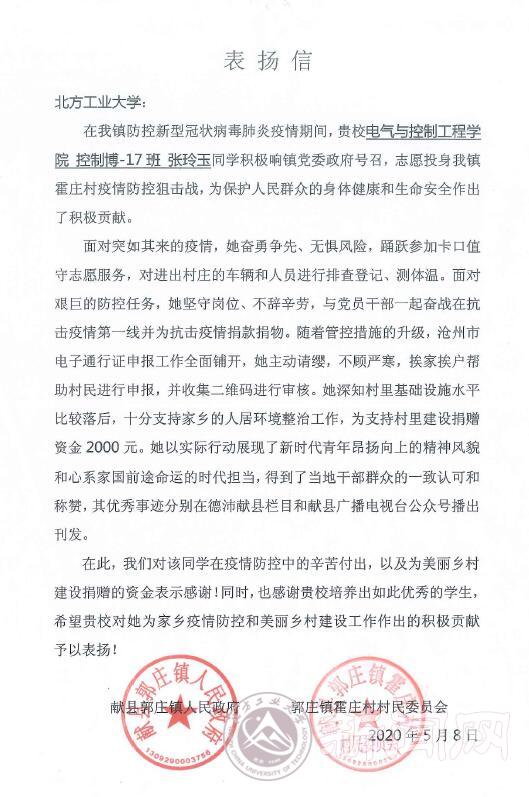 近日,电控学院党委收到一份邮政快递,是由河北献县郭庄镇人民政府和郭庄镇霍庄村村民委员会专门邮寄的表扬信,朴实无华的字里行间闪现的是bat365学生党员临危不惧、冲锋在前、敢于担当的点点滴滴,是一个新时代大学生的风貌。
