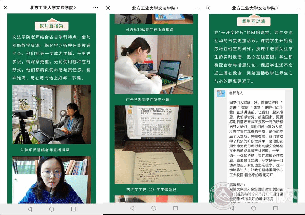 学院教师积极适应课堂教学新形势,积极研讨、认真备课,主动将思政元素融入课堂教学;经常性利用业余时间开展线上教学答疑、学业辅导、线上读书会等活动。
