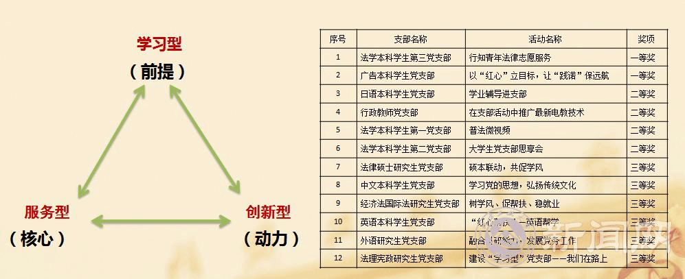 实施党旗领航工程,通过“一支部一特色”党建品牌创建活动,激发支部活力,推动学习型、服务型、创新型党支部建设。积极发挥党团组织优势,引导师生发挥模范作用,以法治教育为抓手开展习近平法治思想宣传和宪法日宣传;积极主动走进革命纪念地、教育基地、走进社区开展形式多样的红色1+1、调研学习、志愿服务等活动,切实将践行社会主义核心价值观融入校园生活和人生发展中。
