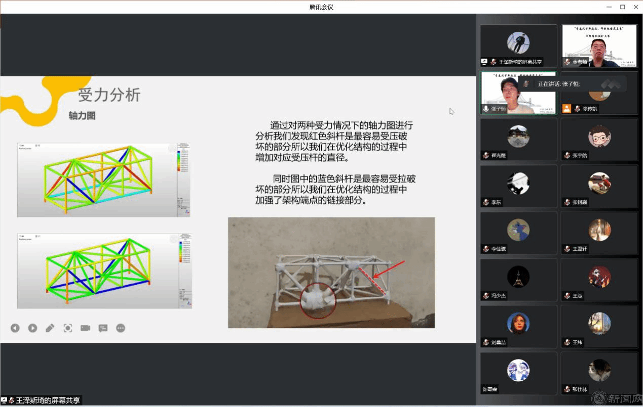 决赛形式为线上答辩,分为团队作品展示、结构受力分析和现场答辩三个环节。大赛现场,师生互动气氛热烈,崔光耀教授还对参赛作品及选手的总体表现进行了逐一点评。经过评委打分,最终确定张子恒小组荣获一等奖。