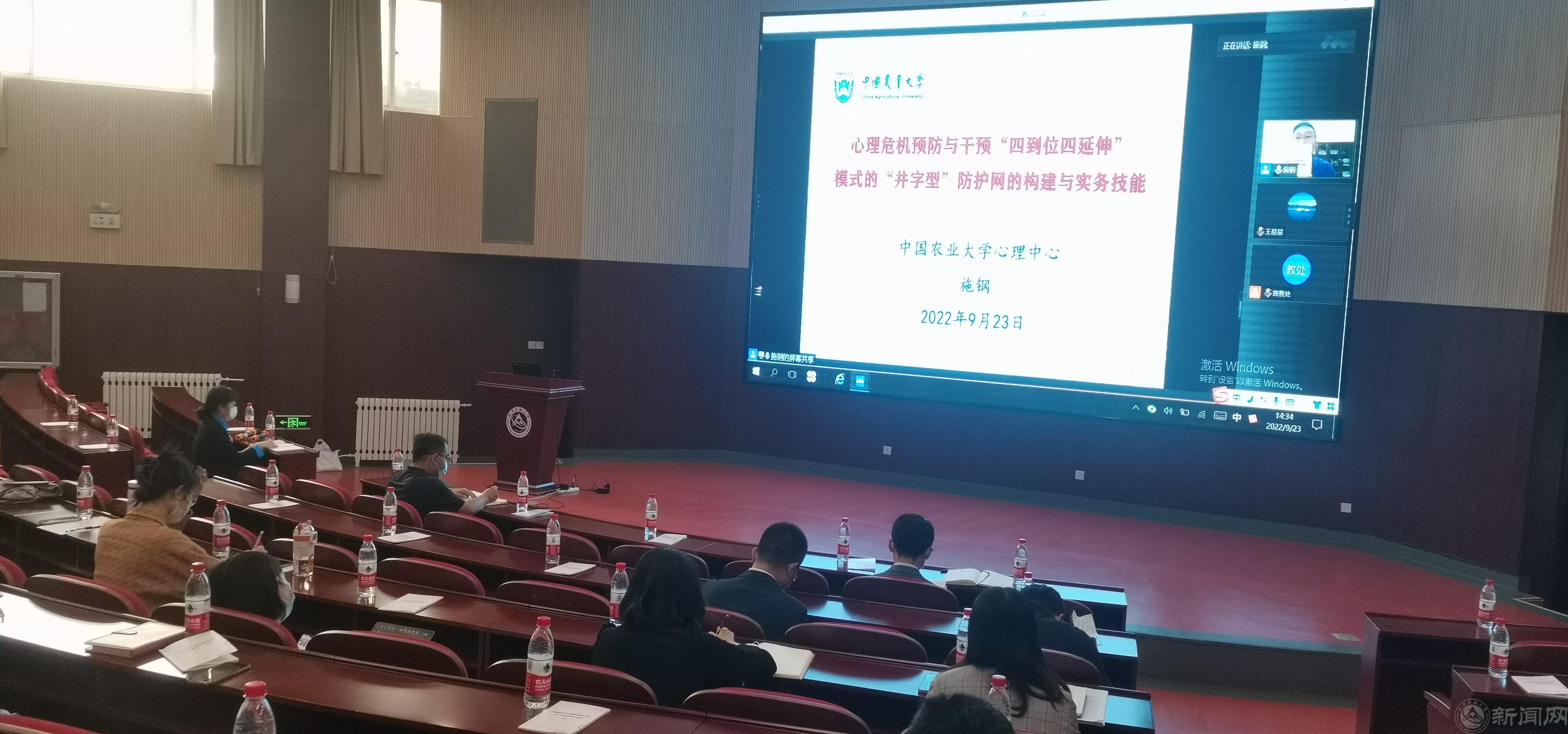 培训由中国农业大学心理素质教育中心主任施纲主讲。施纲老师从农大的工作经验出发,重点介绍了在工作中要围绕学生、关照学生、服务学生,做到情况早了解、问题早发现、危机早预防的工作经验。详细讲解了心理危机预防与应对的方法和技巧,提出要把工作从主体、时间、空间、过程四个维度做到人人到位、层层到位、步步到位、环环到位。