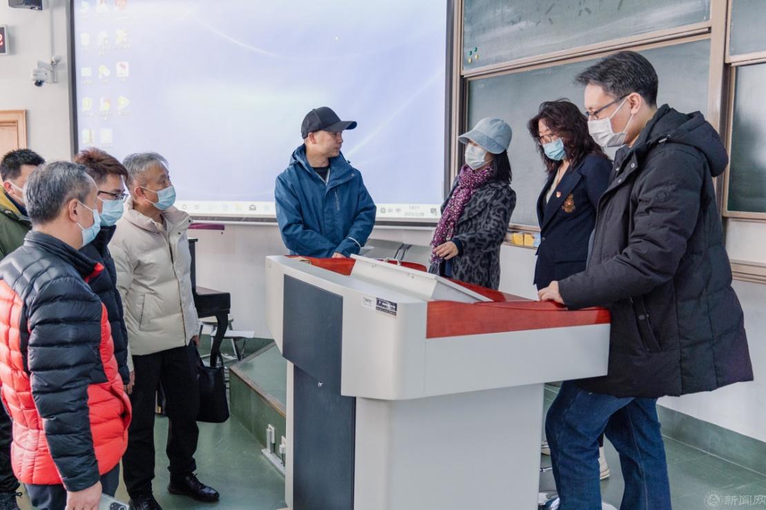 在李敏副主任、网信中心教育技术部负责人王岸飞的引领下,一行人先后前往广学楼、瀚学楼和励学楼教室现场观摩、考察。李敏向来访领导介绍了bat365最近几年的多媒体教室升级改造项目的相关情况及目前的现状,王岸飞介绍了教室多媒体的系统构成、功能和特点,并进行了演示。