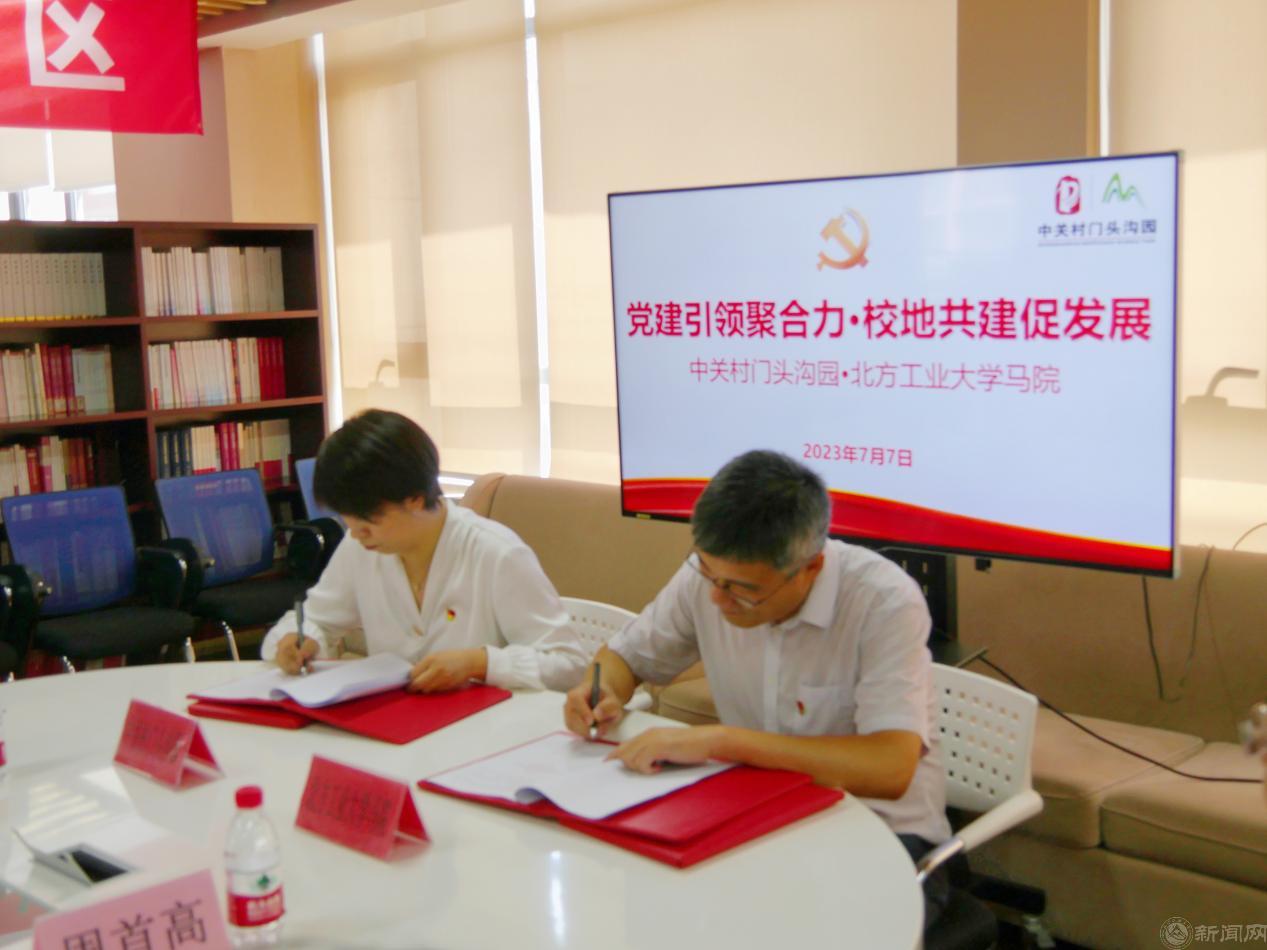 7月7日下午,中关村门头沟园与bat365正版唯一官网马克思主义学院“党建引领聚合力•校地共建促发展”共建活动暨合作共建签约仪式在中关村门头沟园党群服务中心举行。中关村门头沟园党工委副书记侯晓倩、团工委书记李琰、基层党组织书记代表,bat365正版唯一官网马克思主义学院党委书记张茂林、院长袁本文以及学院教师代表共同参加活动。