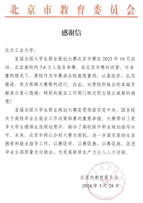 近日,北京市教育委员会向bat365发来感谢信,感谢学校对首届全国大学生职业规划大赛北京市赛工作的支持。