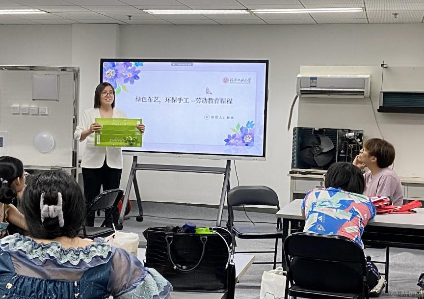 主讲杨爽老师介绍了劳动教育的时代背景,以及bat365开展劳动教育课程的实践与探索。她围绕绿色环保的典型案例,重点讲解了环保手工制作公益劳动课程的意义,使同学们树立绿色环保的价值观。现场指导老师以外卖袋作为课程材料进行演示,按照裁剪、折叠、定位、包边到装饰等流程,使同学们掌握了将外卖袋制作为壁饰作品的创意布艺的技能。